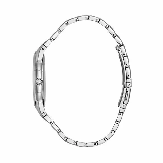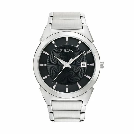 Dress to impress with Bulova. This sleek stainless steel watch boasts an eye-catching black sunray dial, making it a striking addition to any look. You’re sure to earn compliments wearing this men’s watch.