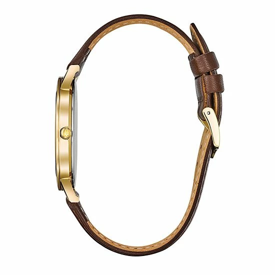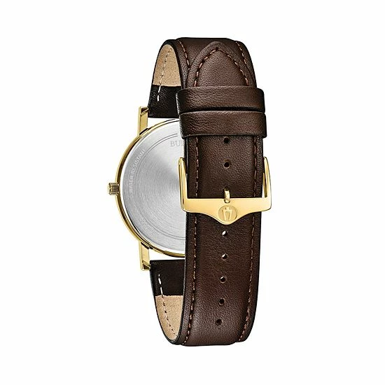 Slim, sleek and stylish, this men’s leather watch from Bulova adds a classy touch to any look.