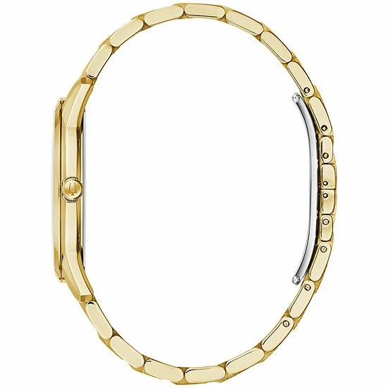 From the Bulova Classic collection, this stainless steel watch features a black dial, gold-tone case and bracelet with double-press deployment closure, three-hand calendar, and flat mineral glass.