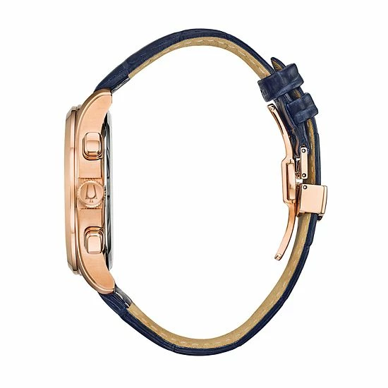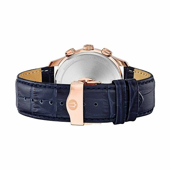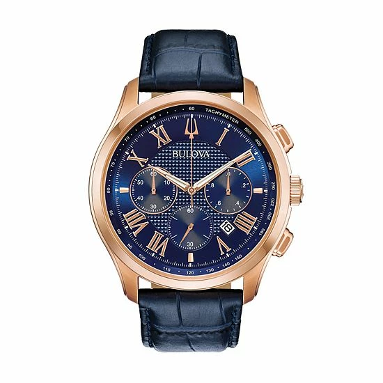 With its brilliant blue sunray dial and matching leather band, this men’s chronograph watch from Bulova’s Wilton collection makes any loop pop.