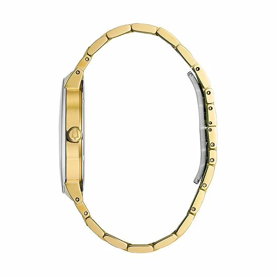 Diamond-accent hour markers dot the sleek black dial on this men’s Bulova watch to give it a luxurious look.
