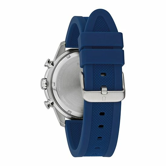 Add a modern twist to your athletic style with this men’s sport blue silicone strap chronograph watch by Bulova.