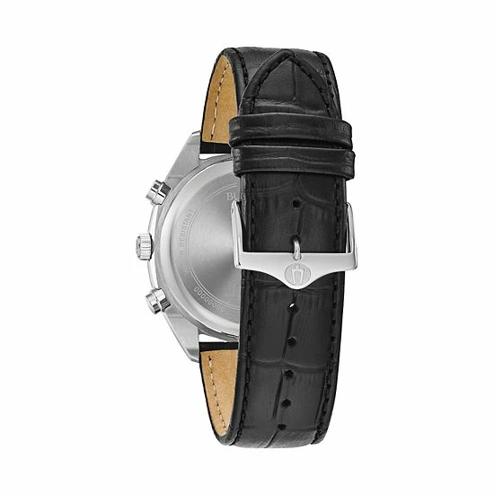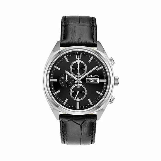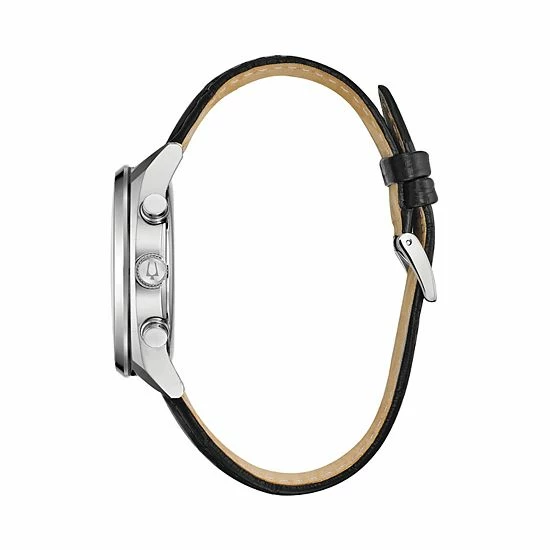 Featuring a sophisticated dial and handsome leather band, this men’s Bulova chronograph watch is a must-have for the modern gentleman.
