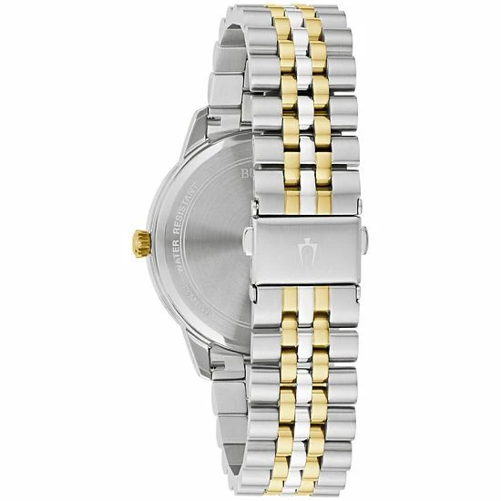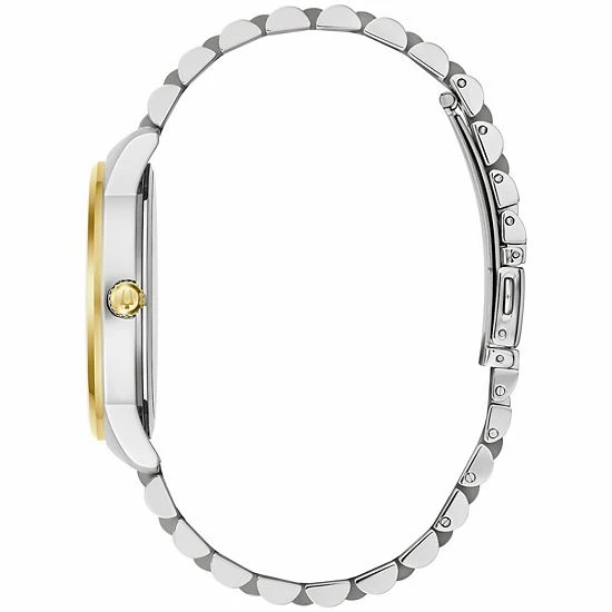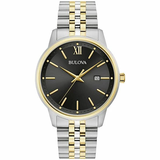This Classic two-tone watch has a stainless steel, gold- and silver-tone bracelet and case, with a black three-hand dial, as well as a calendar feature. It uses a quartz movement and is water resistant up to 30 meters. This watch brings an effortless, timeless style and a look of luxury at a great value.