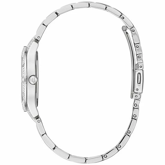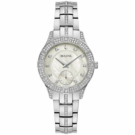 Featuring a mother-of-pearl dial, and embellished with dazzling crystals, this women’s Bulova watch lends a touch of refinement to any casual or business attire.