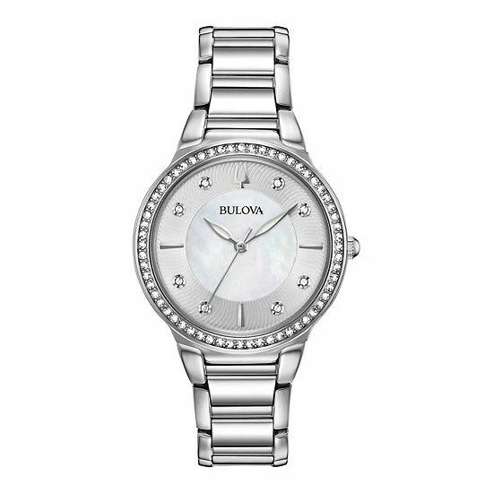 Fashioned with a mother-of-pearl dial and crystal accents, this Bulova women’s watch offers classic style.