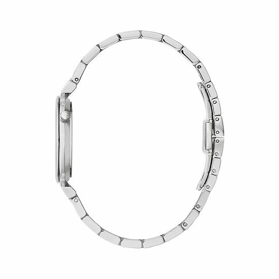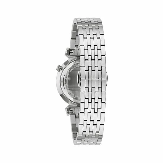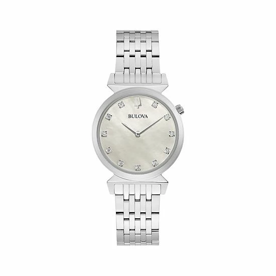 Inspired by Bulova heritage timepieces, this stainless steel watch features a white mother-of-pearl dial set with 11 diamonds, slim quartz movement, and water resistance to 30 meters.